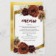 Ce menu mariage est composé de fleurs d'automne écossaises à l'huile rustique peintes en bordeaux et toniques sur la verdure et d'herbe de pampas avec un cadre élégant de feuillage doré et arrière - plan.