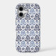 Decorative damask surface pattern design in dark and mid-blue blue detail on a pale cream color background.