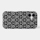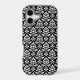 Vintage inspired decorative damask surface pattern design in white detail on a black background.