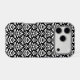Vintage inspired decorative damask surface pattern design in white detail on a black background.