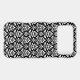Vintage inspired decorative damask surface pattern design in white detail on a black background.
