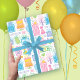 50e anniversaire pâle rose pastel, bleu, vert, violet et orange gâteau de fête, cadeaux et ballons. Chaque cadeau porte le numéro 50 pour que la fille d'anniversaire se sente spéciale. Des papillons, des fleurs, des xo's et des coeurs sont ajoutés dans tout le motif. Joli papier d'emballage girly pour une célébration de 50ème anniversaire.