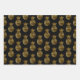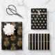 Papier d'emballage de trois feuilles en coordination noir et or. La feuille 1 est noire avec des ananas en or, la feuille 2 est un motif de pois d'or sur le noir, et la feuille 3 est un motif rayé d'or sur le noir. Contactez-nous pour obtenir de l'aide sur la personnalisation ou pour demander des produits correspondants ou coordonnés.