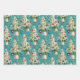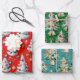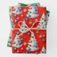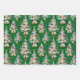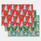 Cet ensemble de papier d'emballage présente un thème de Noël fantaisiste et rétro. Les décors présentent un motif répétitif d'arbres de Noël blancs et moelleux, décorés d'ornements vintages colorés et de guirlandes perlées. L'un est conçu contre un arrière - plan rouge vif, l'autre est sur un arrière - plan vert classique. La troisième option, avec un arrière - plan bleu clair, comprend des cloches suspendues et des détails sur la neige. Ce papier de charme est parfait pour tous ceux qui aiment la nostalgie d'un séjour du milieu du siècle.