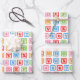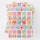 Un trio d'adorables papiers d'emballage avec un motif continu et répétitif de blocs de construction de bébé avec l'alphabet et les chiffres en rose, bleu, vert, orange, rouge et jaune. Elles sont idéales pour le baby shower ; arrivée du nouveau-né ; fête d'anniversaire et fête de naissance.