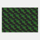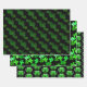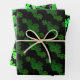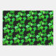 Papier d'emballage shamrock et vertes avec trois motifs. Les trèfles verts réalistes font un motif sur gris argenté. Des trèfles amusants, illustrés à quatre feuilles, dans des tons vert vif sont modelés sur du vert foncé. La dernière feuille de papier est noire avec des tasses vertes de bière en cliquant pour dire "applaudissements" pour une fête d'anniversaire ou autre événement.