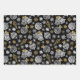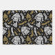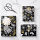Un ensemble festif et moderne de feuilles de papier d'emballage en blanc et or sur des arrière - plans noirs. Trois motifs différents qui comprennent des cloches et des ornements de Noël, des souris, des écureuils et des cadeaux, et des vêtements d'hiver confortables.
