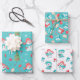 Cet ensemble de draps cadeaux de Noël présente des images amusantes de bonhomme de neige sur deux des draps. La troisième feuille a des images assorties de cadeaux aux enveloppements éclatants, des hommes en pain d'épice, des sucres de canne et des lollipops. L'arrière - plan pour les images principalement bleues, roses, blanches et vertes est bleu sur deux feuilles, et blanc sur la troisième. Mignonne pour les enfants !