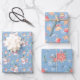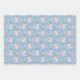 Un ensemble coordonné de feuilles de papier d'emballage d'hiver en bleu pour vos besoins de cadeaux saisonniers. Ici nous avons un bonhomme de neige dansant dans un casquette vert joyeux avec un foulard rayé rouge. On y trouve de jolis poincolas aux flocons de neige et à la verdure. Et la saison des fêtes n'est pas aussi joyeuse sans les ornements, les cloches et le pain d'épices !