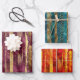 Brossez les traits et les feuilles de papier d'emballage confetti. La première feuille présente des coups de pinceau en bordeaux et or et confettis, la deuxième en bleu turquoise et la troisième en orange.