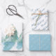 Papier d'enveloppement de Noël de la forêt d'hiver calme et paisible. Dessin d'aquarelle d'une forêt en hiver et en neige, arbres d'hiver avec neige en bleu et vert. Les deuxième et troisième feuilles ont un script de jours fériés paisibles dans un script tendance.