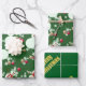 Christmas wrapping paper sheets with snowmen on two and Merry Christmas on one. Snowflakes and ornaments decorate the background.