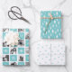 Faites ressortir vos cadeaux de vacances avec notre papier d'emballage photo collage, avec 15 de vos photos préférées de carré ou Instagram en noir et blanc, disposés dans une grille. Les photos alternent avec des carrés d'aqua turquoise glacée ornés de flocons de neige, de pins hivernaux et votre monogramme initial en blanc. Les feuilles de coordination comprennent les pins et les flocons de neige.