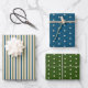 Ces draps d'emballage cadeau d'inspiration rustique présentent des pois et des rayures dans des tons chauds de vert de forêt, de bleu profond et de crème.