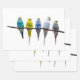 Row of budgie birds on a tree branch