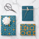 Ensemble de trois feuilles de papier d'emballage avec différents motifs décoratifs dans les tons bleu et orange.