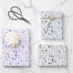 Elégant terrazzo violet blanc turquoise design artisanal découpage feuilles d'emballage papier ensemble de trois motifs différents. Cool, chic, tendance, moderne. Copyright photo Marg Seregelyi Photography.