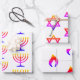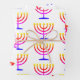 Enveloppement cadeau de vacances avec un thème d'inspiration hébraïque de la Menorah, l'Étoile de David, et la flamme. La couleur Arrière - plan peut être modifiée et sélectionnée en modifiant l'image. HAMbyWhiteGlove. Montré avec un arrière - plan blanc et des graphismes arc-en-ciel.