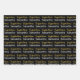 Ce papier d'emballage noir a un faux (pas de feuille) script d'or qui dit Félicitations. Il contient également du texte blanc pour le nom du destinataire. (Montré : Samantha) Le texte est dans un motif.