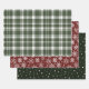 Ferme Tartan Plaid ensemble vert et rouge de 3 feuilles de papier d'emballage. Les 3 modèles sont rustiques plaid de campagne, des flocons de neige traditionnels et de la neige simple.