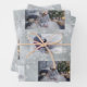 Festive Grey Photo Flamme de neige Script de Noël Enveloppement Feuilles de papier. Écriture tendance et beaux flocons blancs de différentes tailles et formes sur un arrière - plan gris. Photos de famille personnalisées et papier d'emballage de nom. Insérez 2 photos dans les modèles et personnalisez avec votre nom de famille.