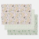 Adorable ensemble de 3 feuilles individuelles de papier d'enveloppement de la Saint Patrick, dessiné à la main par Nathalie Portet à l'encre noire. Feuille #1 : Présente un design fantaisiste de pièces d'or dans un motif curieux, des pots d'or sous les arc-en-ciel, des trèfles verts, des chaussures de cheval, des casquettes leprechaun, des coeurs verts, de minuscules champignons verts et un souhait de chance. Feuille #2 : Présente un motif en vichy rose et vert pastel. Feuille #3 : Présente des trèfles et des textes "chanceux" contre un motif festif rayé rose et vert.