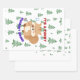 A cute and festive digital illustration featuring a chubby cartoon squirrel singing joyfully into a microphone. The squirrel is surrounded by blue musical notes, holding the mic with excitement. The text above and below reads "IT'S A FUNNY SQUEAKY SOUND" in bold red and purple font. The background consists of a repeating pattern of green sketched Christmas trees on a light grey backdrop, creating a humorous and holiday-themed design perfect for winter celebrations.