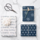Un ensemble rustique de trois feuilles de papier d'emballage coordonnées dans une palette de couleurs bleu et ivoire. On a Joyeux Noël écrit dans une police manuscrite moderne. Le deuxième est doté d'un motif abstrait de sapin de Noël et le troisième d'un motif de flocon de neige.