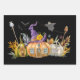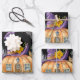Envelopper des feuilles de papier avec une jolie image d'une maison citrouille hantée avec un grand casquette de sorcières sur le dessus et des fantômes et des chauves-souris volant autour.