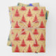 Ce design unique, moderne, dessiné à la main, présente des arbres de Noël verts, rouges, bleus motif avec des détails de parties scintillant étincelants et complexes sur l'arrière - plan d'or faux jaune. Ce papier d'emballage est un excellent ajout à votre fête de Noël.