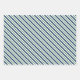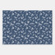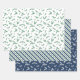 Feuilles papier d'emballage de Noël bleu, vert et blanc avec motifs aux couleurs assorties : une avec brindilles vert. Un avec des rayures bleues, vertes et blanches. Et un en bleu marine avec des brindilles blanches.
