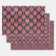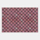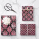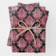 Un ensemble de trois draps d'enveloppement cadeau coordonnés avec un motif damassé rose sur un arrière - plan noir.