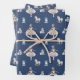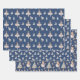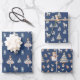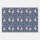 Ensemble de papier d'emballage de vacances avec ballerine, cheval à bascule et motif d'horloge décoratif. Deuxième avec les bonhommes de neige, les arbres de Noël, les hommes en pain d'épice et les chevaux rocking. Troisième avec les arbres de Noël, les chevaux à bascule et les cadeaux. Arrière - plan bleu.
