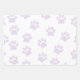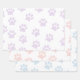Ces feuilles de papier d'emballage parfait pour un chat / amoureux des chiens ont un motif simple mais mignon de violet, rose et bleu empreintes de pattes contre un arrière - plan blanc.