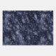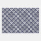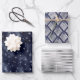 Cet assortiment de papier d'emballage de vacances glam comprend un motif de faux flocons d'argent sur un arrière - plan de faux feuillard bleu marine, un motif de ventilateur d'art déco de faux feuillards argent sur un arrière - plan bleu marine, et un motif de bande de faux feuillards en satin argent.