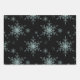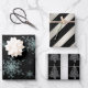 Un ensemble de papier d'emballage de Noël noir et argent de trois motifs différents. La première feuille est ornée d'un motif de flocons de parties scintillant bleu/argent cristallin sur un arrière - plan noir, la deuxième est ornée d'un motif de rayures diagonales noires et argentées et la troisième est ornée d'un autre motif rayé argenté avec de petits arbres de Noël argentés.