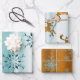 Un bel ensemble d'enveloppement de Noël en turquoise et or. Il y a trois feuilles en tout, la première avec un motif de flocons de neige brillant de turquoises flocons de cristal, la deuxième avec un troupeau de rennes dorés et des éclats blancs sur un arrière - plan turquoise pâle/aqua, tandis que la troisième feuille a un motif de cristaux de glace bleus sur un arrière - plan riche et doré.