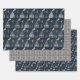 Ensemble de 3 draps d'enveloppement cadeau coordonnés en bleu et tans avec une feuille de plaid et deux feuilles de maisons sur un arrière - plan bleu foncé.