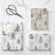 Ce papier d'emballage rustique de Noël en bois de 3 feuilles présente des motifs de pins d'hiver aquarellés : une feuille avec étoiles dorées, une avec arrière - plan kraft couleur et une avec arrière - plan blanc cassé enneigé.