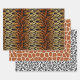 Papier enveloppant en trois posters de animaux - imprimé tigre en ambre profond / rouille brun et bronzé avec rayures noires, motif girafe dans les tons cuivre, beige et chocolat brun, et un minimaliste motif de guépard de taches noires sur un arrière - plan blanc