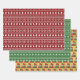 Ensemble de 3 feuilles d'emballage de Noël colorées et festives. Rouge avec un motif de flocons blancs et d'arbres de Noël, vert kelly avec un motif de flocons de neige et feuille d'or avec des piles de cadeaux de Noël verts, rouges et blancs.