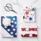 Collection de 3 feuilles de papier d'emballage cadeau patriotique unique pour vos célébrations de la fête de l'4 juillet et de l'Indépendance. étoiles, rayures et pois américains rouges, blancs et bleus.