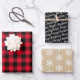 Le jeu d'enveloppes cadeau rustique moderne comprend trois feuilles de papier d'emballage de vacances coordonnés : plaid de buffle rouge et noir brillant, noir avec texte blanc "Joyeux Noël", et kraft brun tan avec motif de flocons d'hiver blanc.