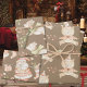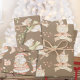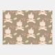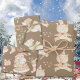Le premier papier d'emballage cadeau de Noël d'un bébé avec des nounours aquarellés, un baby fox volant dans l'air, et Père Noël tenant le bébé dans une feuille trio sur un arrière - plan kraft couleur.