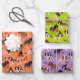 Cute Halloween Cavalier King Charles Spaniel dogs in spooky costumes with several coat colors hold-or-treat pumkins, wear witch hats and sweaters with scattered bats, paws and dog bones.
