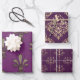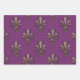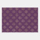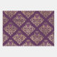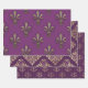 Papier d'emballage à thème Purple et Gold Paris dans trois styles différents, dont les damas roses, fleur de lis et lustres.