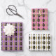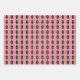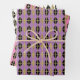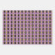 Papier à envelopper qui peut être utilisé pour les vacances et tout au long de l'année. Patter présente des diamants noirs et or avec une grille or sur des arrière - plans blancs, violets et roses.
