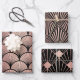 Le trio élégant de feuilles de papier d'emballage présente trois modèles géométriques roses d'or et de noir Art Déco.