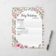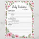 Papier avec le jeu "Baby Predictions & AVIS" pour le baby shower. La feuille de papier de jeu est décorée d'adorables roses d'aquarelle.