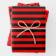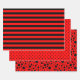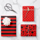 Trois motifs en rouge et noir : rayures de base, pois et taches aléatoires.